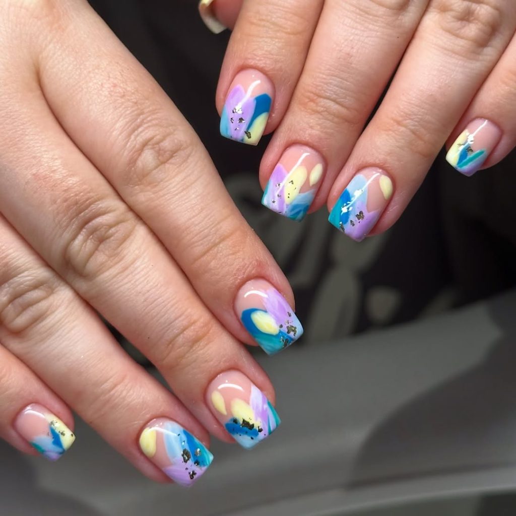 There’s a quiet luxury in this pastel abstract set with subtle gold foil accents. Blue, lilac, and soft yellow blend in painterly strokes, creating depth without feeling busy. The metallic flecks catch the light just enough to add dimension—like jewelry for your nails. It’s a modern Art that feels elevated and intentionally styled.