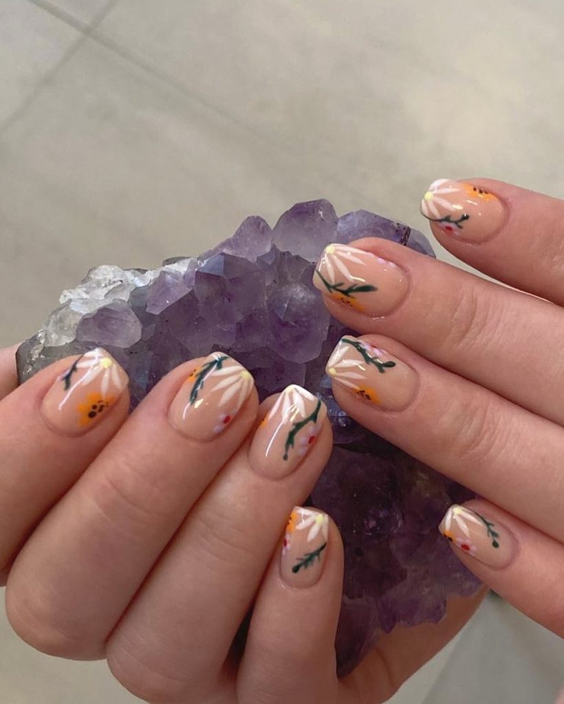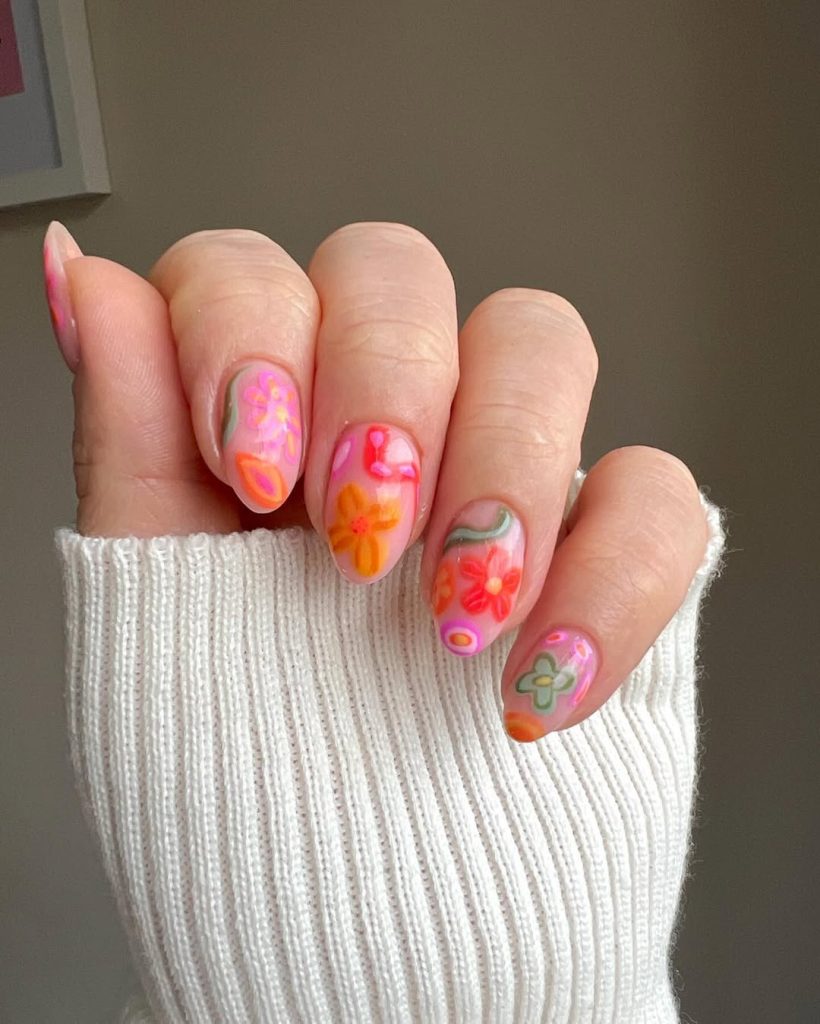 These nails feel like a tiny wildflower field captured in bloom. The soft nude background lets the bright florals and greenery shine, creating a cheerful, optimistic mood that’s pure spring energy. Each nail has its own little Art moment, and together they form a playful, storybook-inspired Design that feels joyful and full of life.