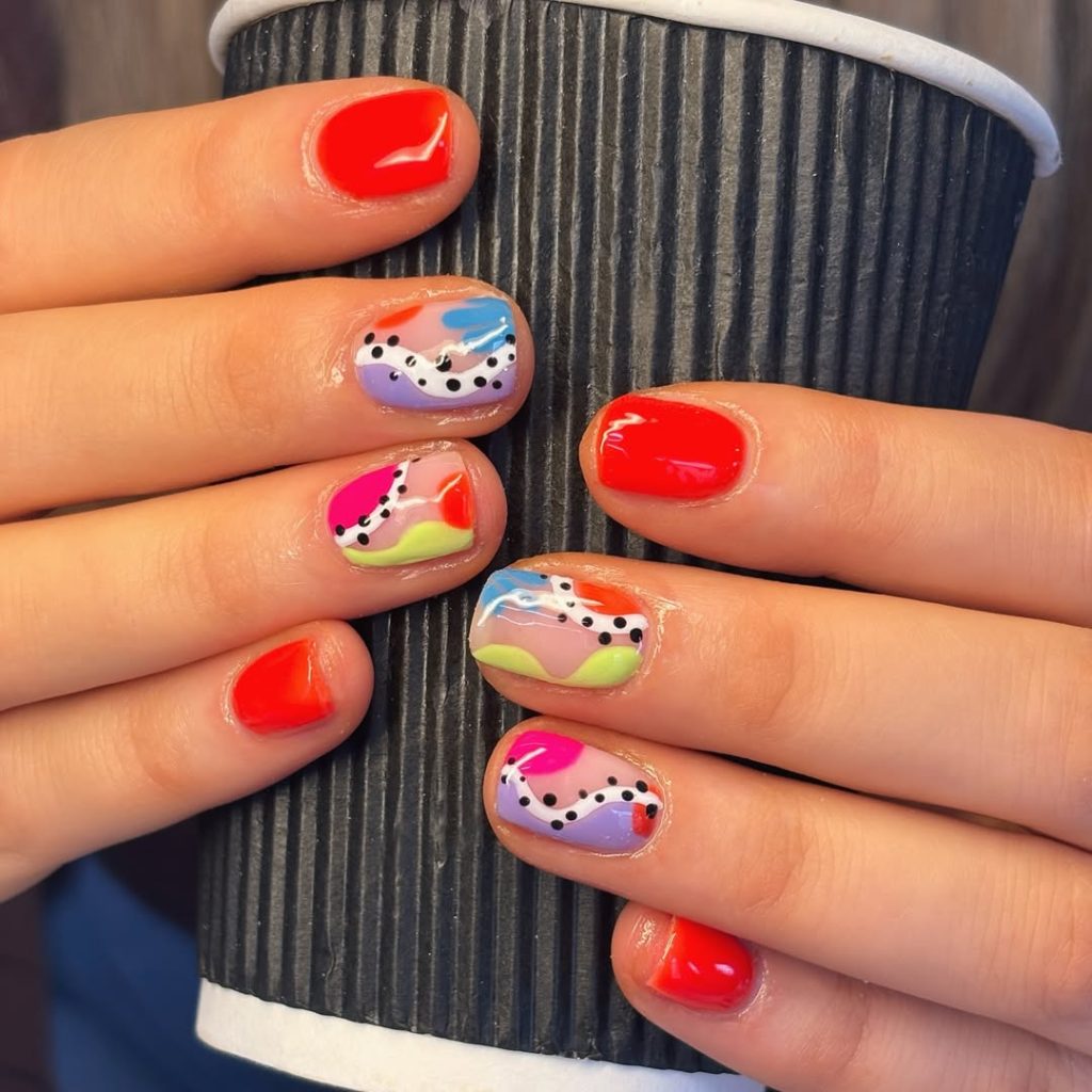 Classic red gets a creative twist here. The glossy crimson base feels powerful and timeless, while the accent nails with pastel waves and dotted details add that unexpected abstract Art moment. It’s like wearing your favorite red lipstick but pairing it with statement earrings—familiar yet fresh.