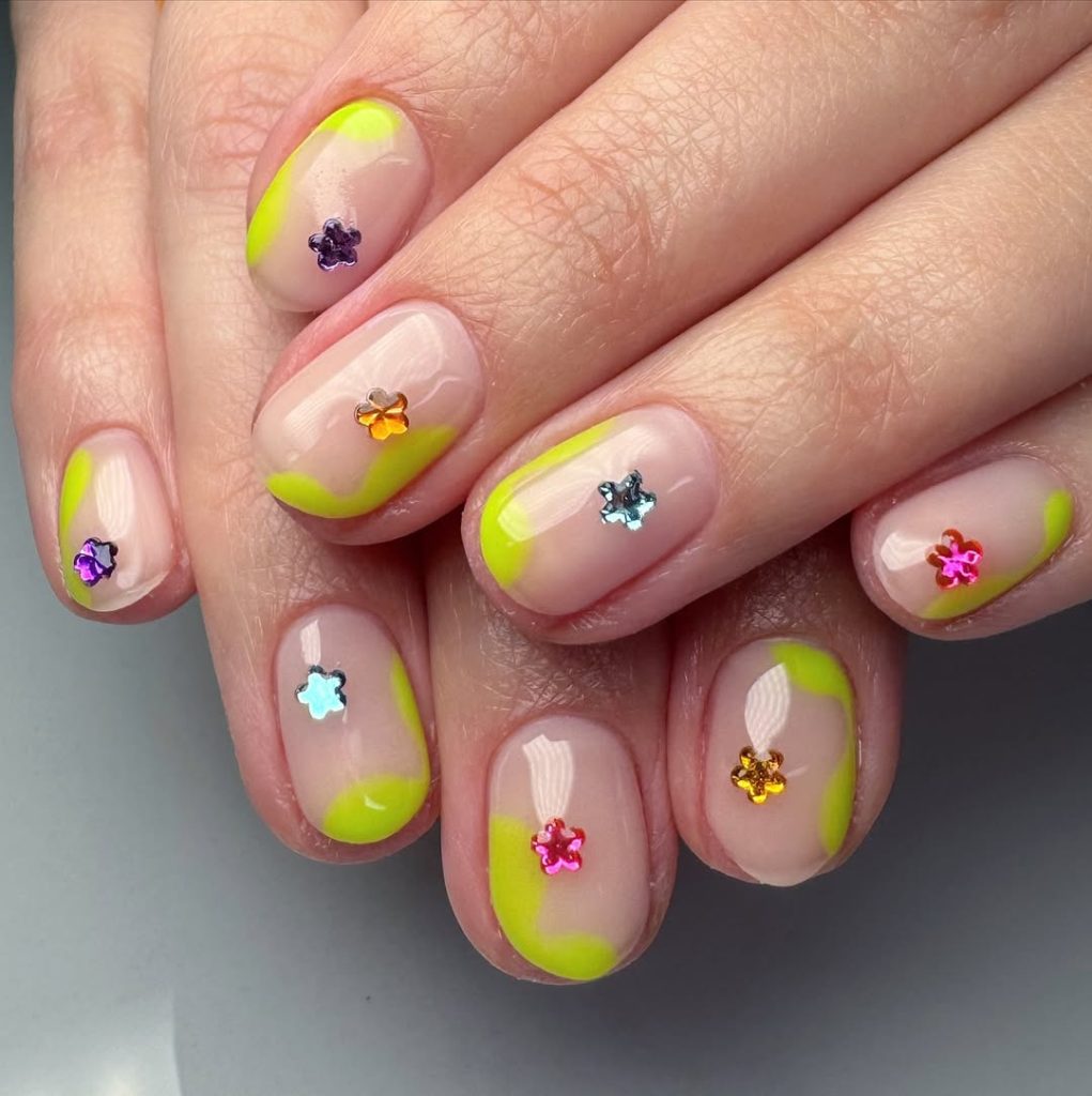 This neon lime French twist feels playful but surprisingly refined. The translucent nude base keeps everything light, while the vibrant green edges add a modern pop. Tiny colorful flower gems bring a touch of sparkle that catches the light just enough. It’s abstract Art with a hint of whimsy—fresh, bright, and completely spring-ready.