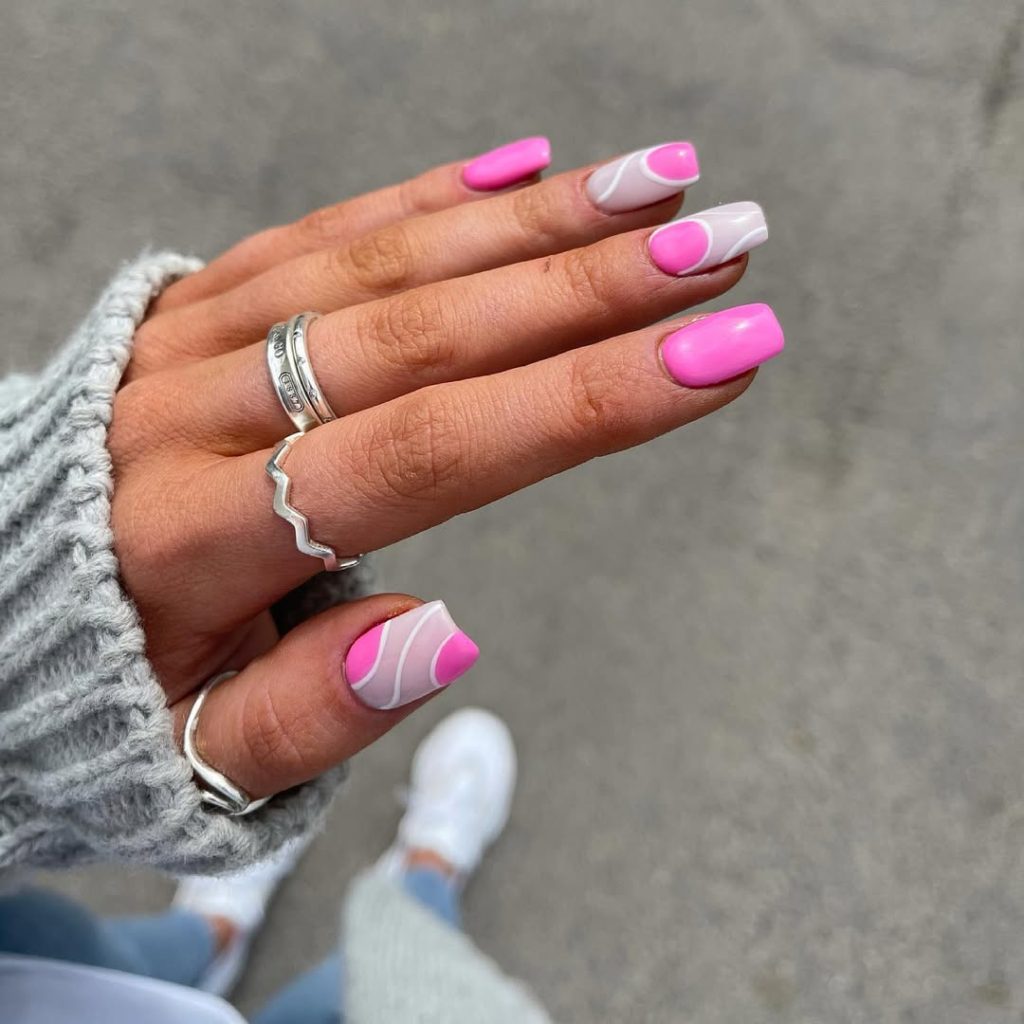 There’s something unapologetically joyful about bold hot pink paired with fluid abstract curves. This look feels like modern Art on your fingertips—playful, confident, and a little bit rebellious in the best way. The mix of vibrant fuchsia, soft nude, and dotted black lines gives that retro-meets-2026 energy that instantly lifts your mood. It’s the kind of Design that turns a simple coffee run into a mini fashion moment.