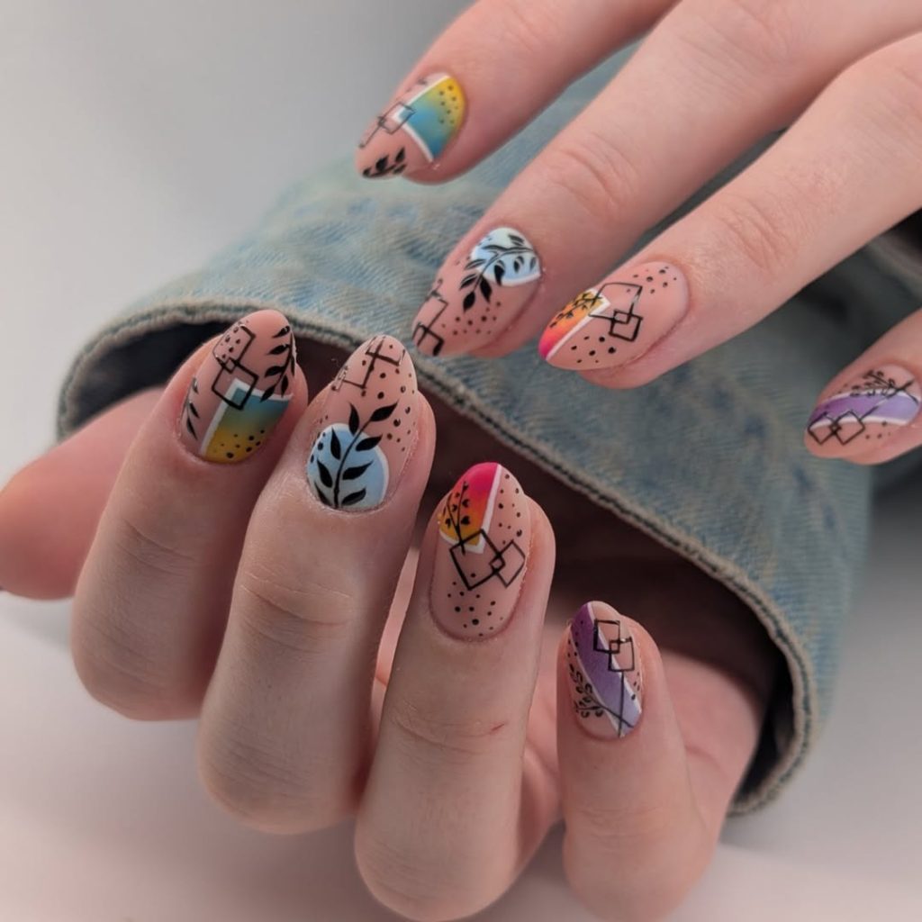 This set is pure creative energy. Soft nude bases layered with pastel blocks, tiny dots, and graphic lines feel like wearable Art straight from a design studio. Each nail tells a slightly different story, but together, they create a cohesive abstract Design that feels thoughtful and curated. It’s playful without chaos—bold but balanced.