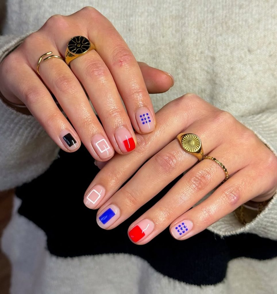 Clean lines, bold primary colors, and tiny geometric accents give this manicure a modern, almost architectural vibe. The combination of red, blue, black, and minimal white shapes feels sharp and intentional. It’s abstract Art with a graphic twist—confident, cool, and a little bit edgy without being overwhelming.