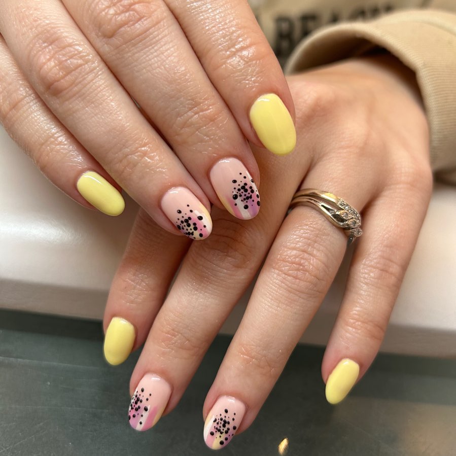 There’s something undeniably cheerful about creamy pastel yellow. It feels like sunshine on your fingertips—light, optimistic, and perfectly suited for spring. The nude accent nails with scattered black dots and a hint of pink add a subtle abstract Art touch, keeping the Design interesting but not overpowering.