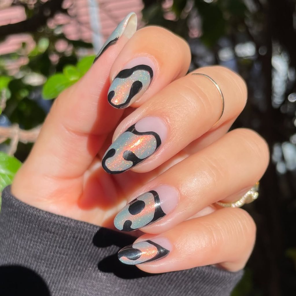 This set brings a little edge to spring. The shimmering base catches the light with every movement, while bold black abstract shapes create striking contrast. It feels modern, confident, and slightly rebellious—the kind of Art that turns a simple manicure into a statement piece. The Almond silhouette adds elegance, keeping the look balanced and refined for 2026.