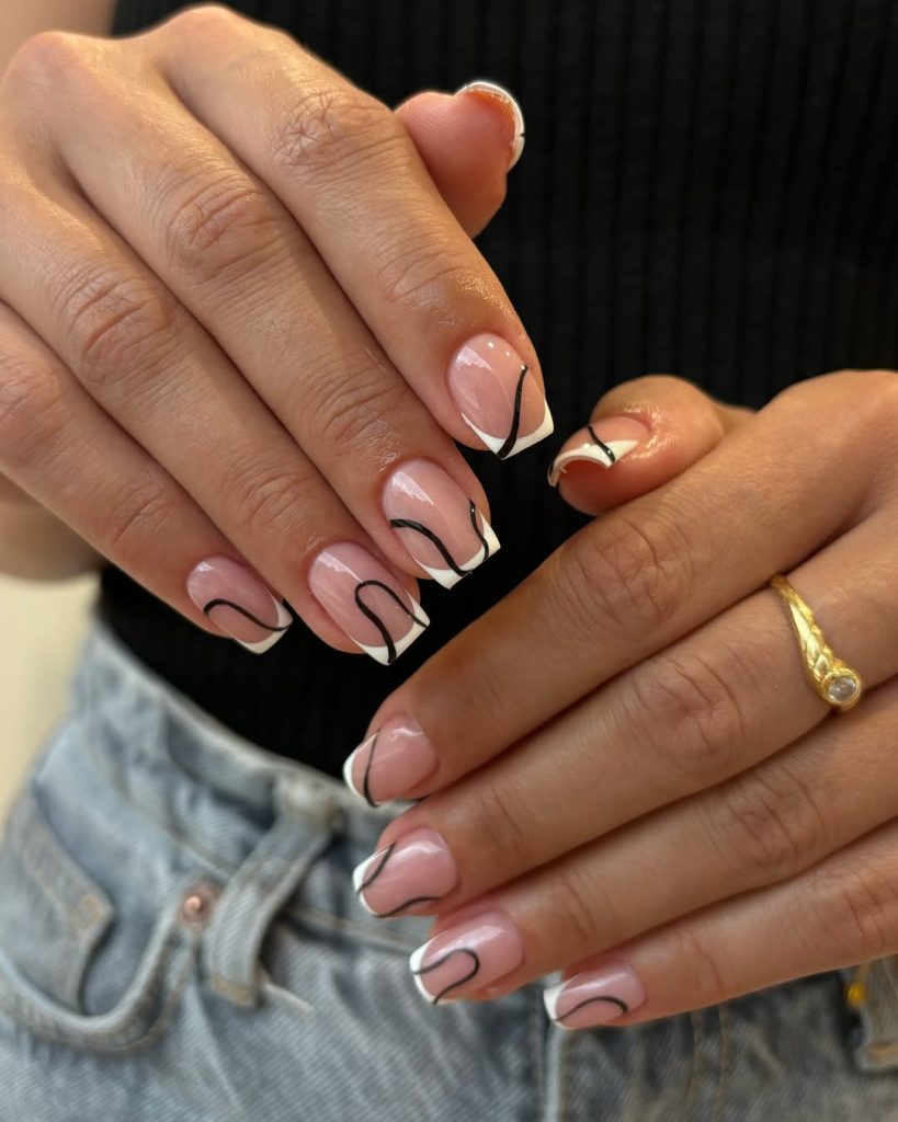 This style resembles the sophisticated counterpart of a traditional French manicure. The soft pink base keeps everything polished and timeless, while the delicate black Art lines add just enough personality to make it feel fresh for 2026. There’s a quiet confidence in this Square design—minimal, clean, and a little bit artsy without trying too hard.