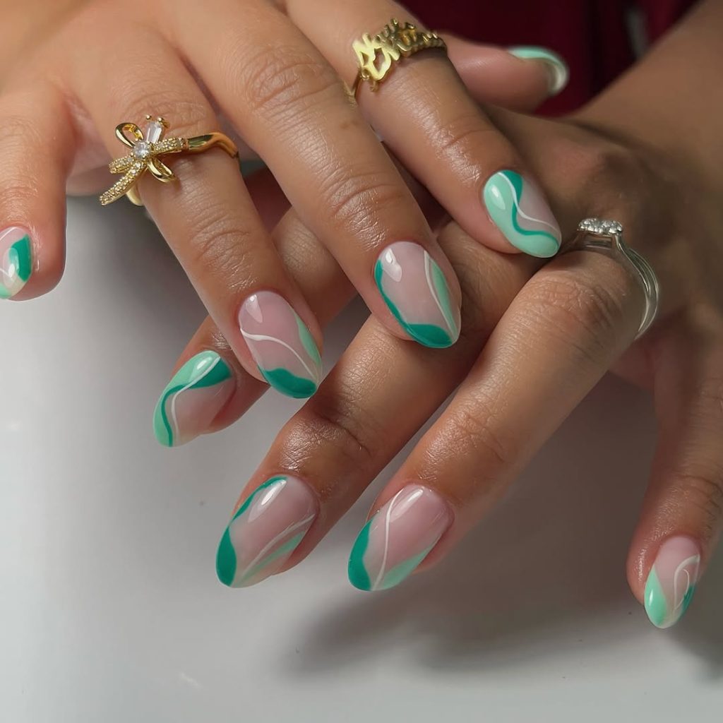 Soft lavender and aqua come together here in a calming, almost dreamy palette. The delicate black leaf detail adds a subtle botanical element, turning this manicure into sophisticated abstract Art rather than a simple color block. It feels serene yet modern—like a quiet morning with your favorite coffee.