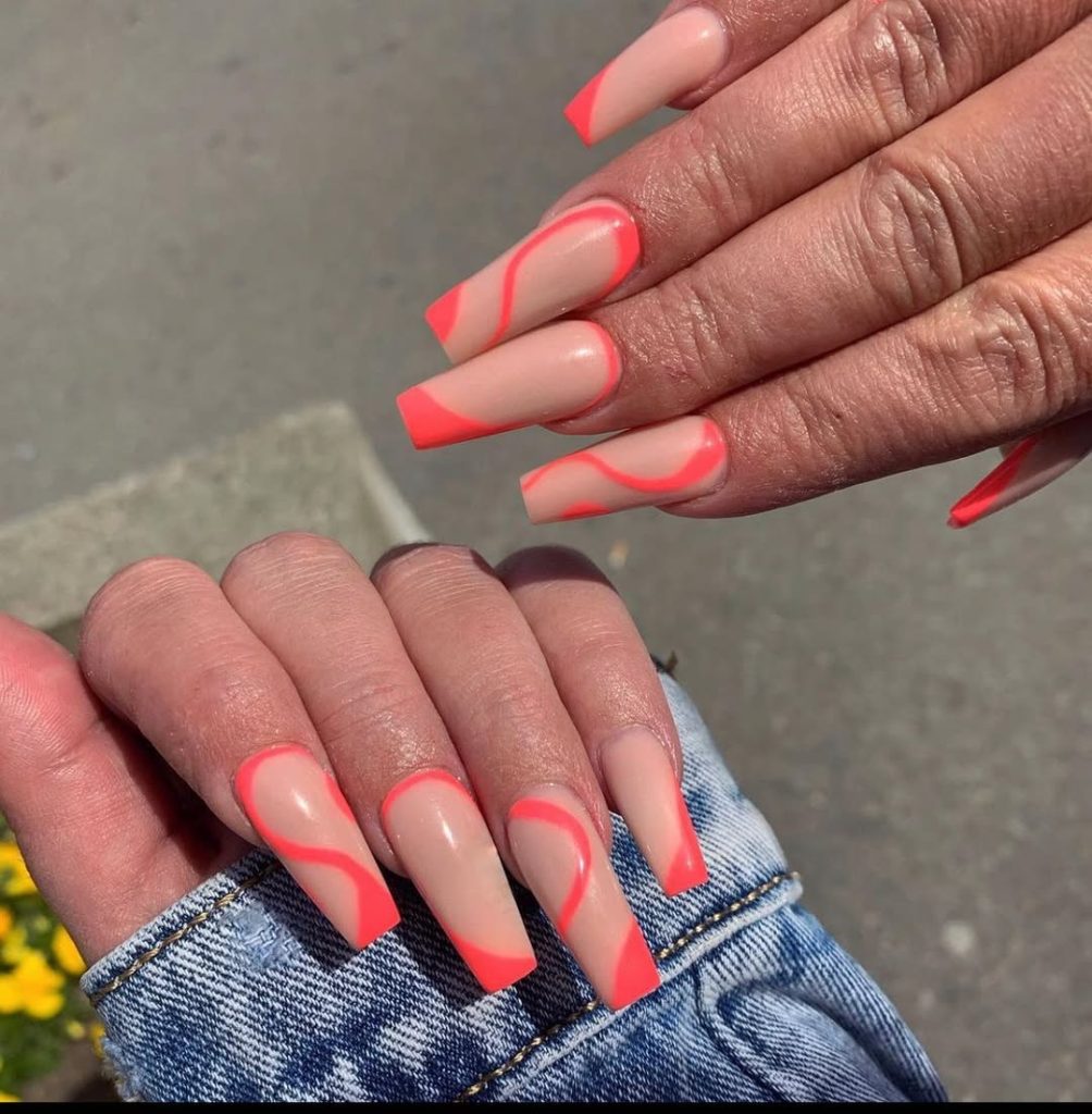 1. Neon Coral Wave Coffin Nails
