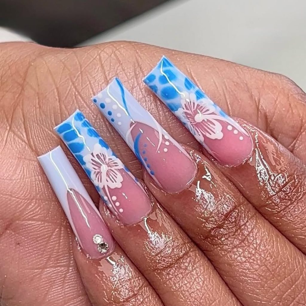 11. Blue Floral Coffin Nails with Soft Nude Base