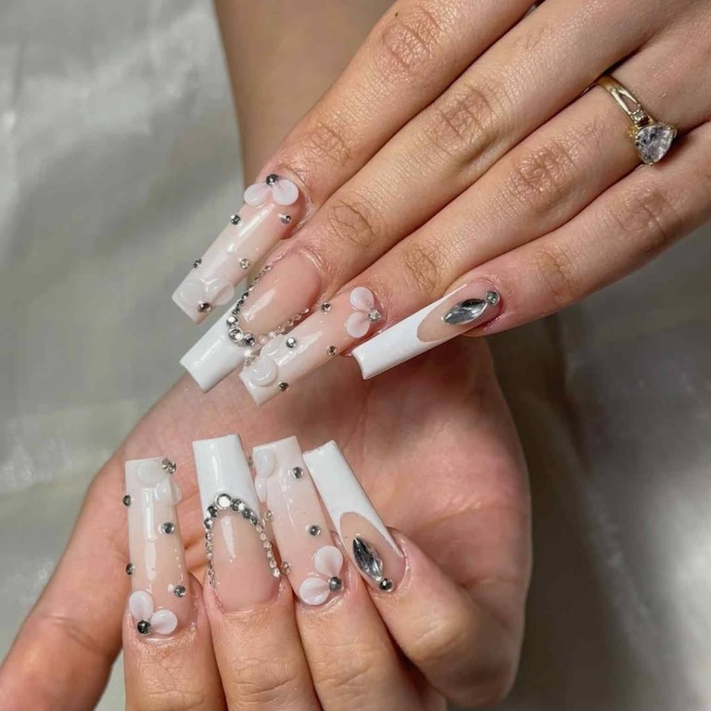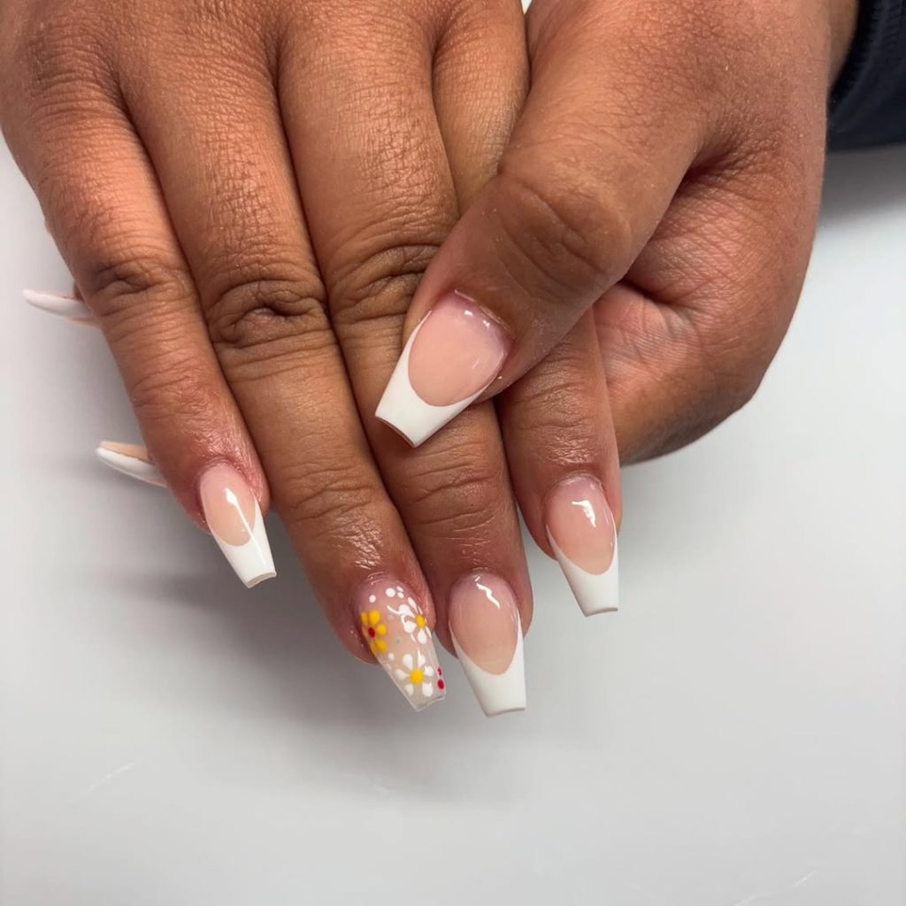 This look is proof that classic styles can still feel fresh. The clean white French tips give a timeless, polished feel, while the small daisy accent adds a hint of spring charm without overpowering the design. It’s elegant, understated, and quietly confident.