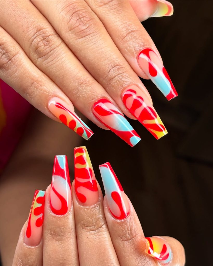 14. Colorful Abstract Coffin Nails in Red and Blue