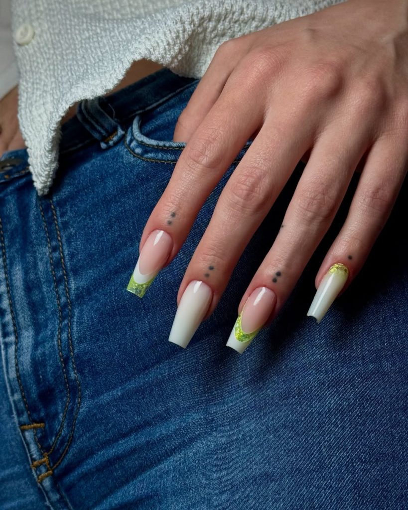 17. Green Glitter French Coffin Nails