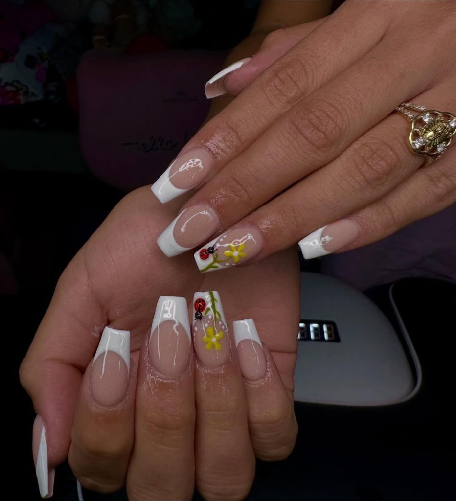 18. White French Coffin Nails with Ladybug Floral Art