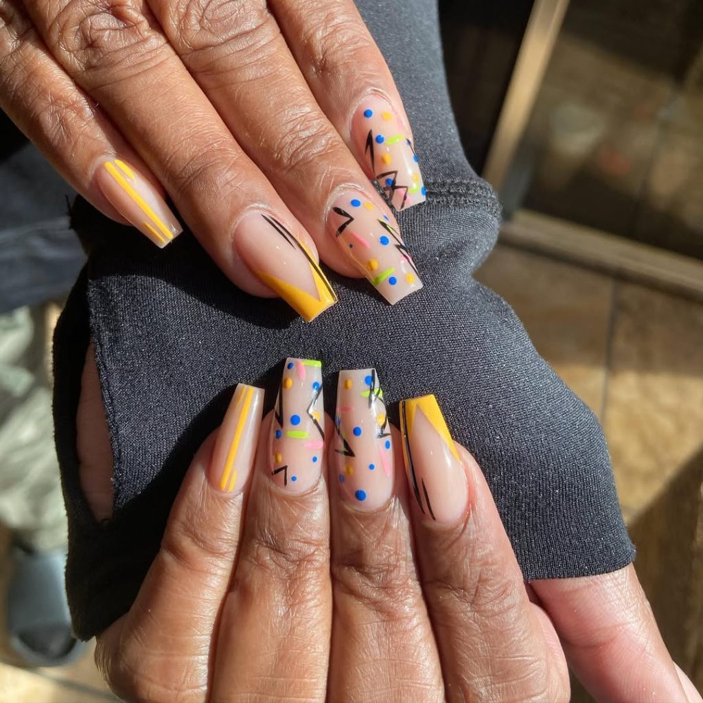 2. Colorful Line Art Coffin Nails