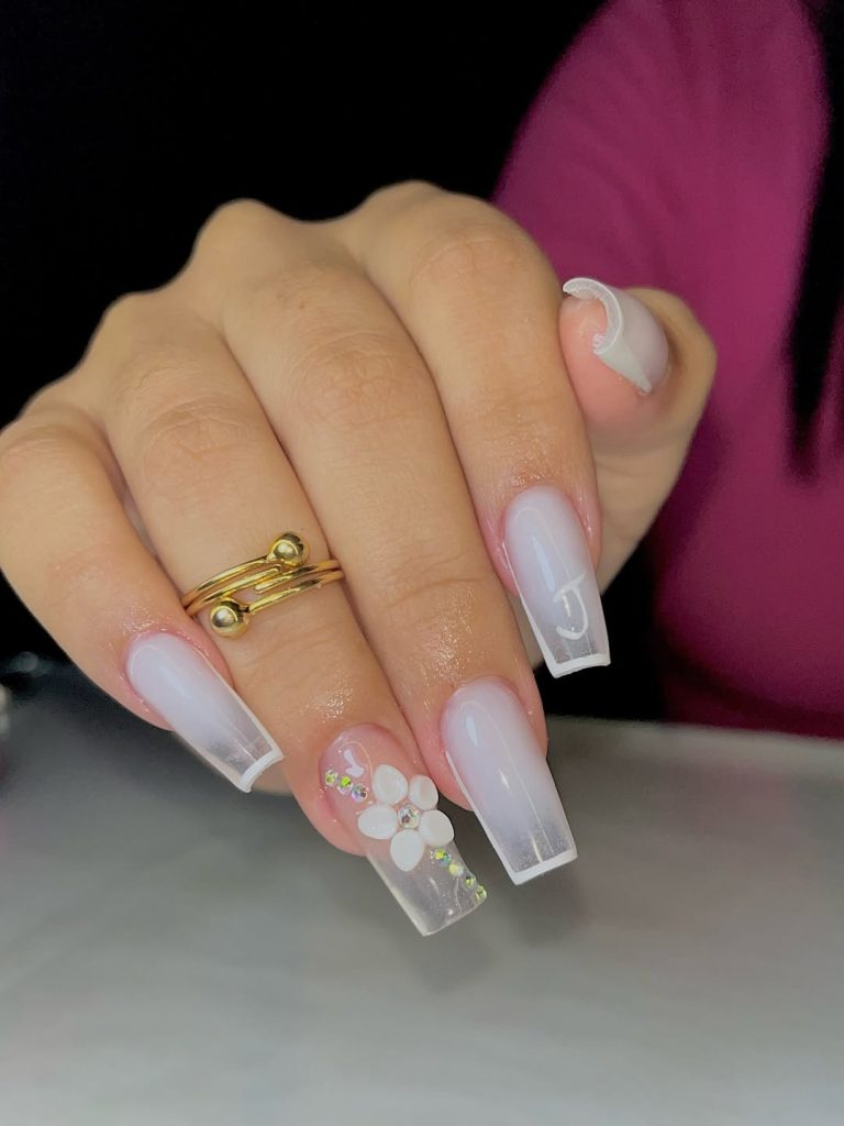 20. Translucent Coffin Nails with White Floral Accent