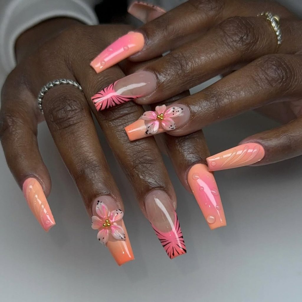 This manicure feels warm, joyful, and full of spring energy. The peachy Pink tones glow beautifully against the skin, while the tropical-inspired floral details add a lively, vacation-ready vibe. It’s the kind of design that instantly lifts your mood and feels playful without losing elegance.