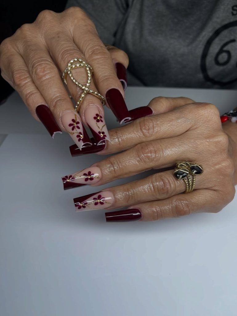 23. Burgundy Coffin Nails with Floral Gold Accents
