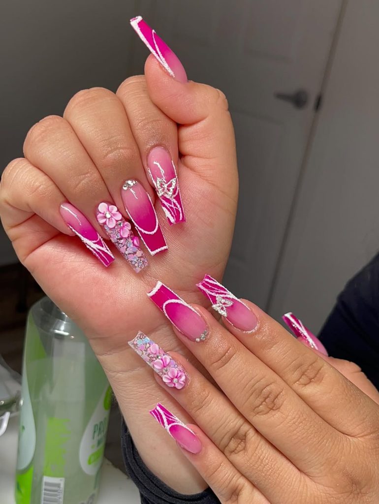 24. Hot Pink Ombre Coffin Nails with Floral and Glitter Details