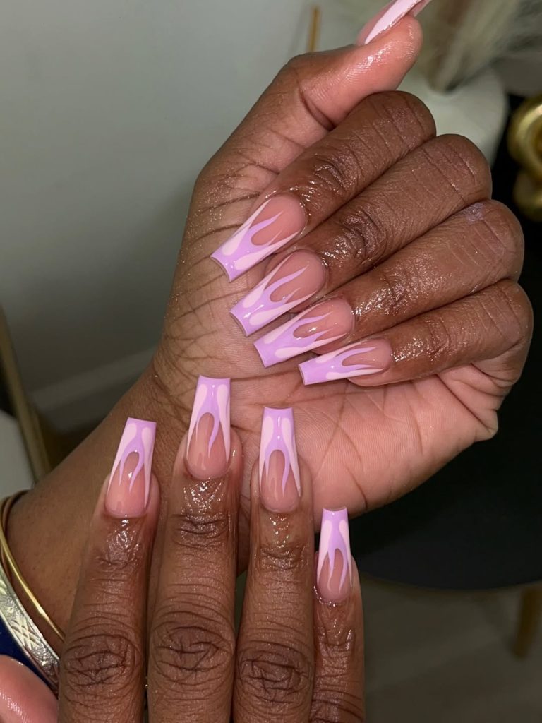 This manicure feels edgy, modern, and surprisingly elegant. The soft nude base keeps the look clean, while the lilac flame design adds movement and attitude. It’s bold without being overpowering, striking a perfect balance between playful and polished.