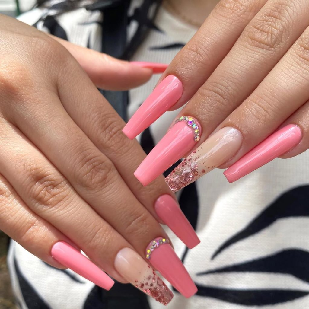 4. Glossy Pink Coffin Nails with Crystal Accent