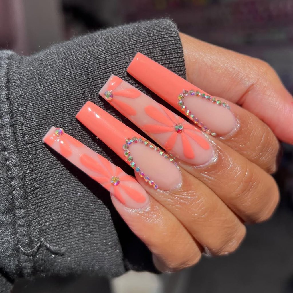 7. Coral Floral Coffin Nails with Rhinestone Details