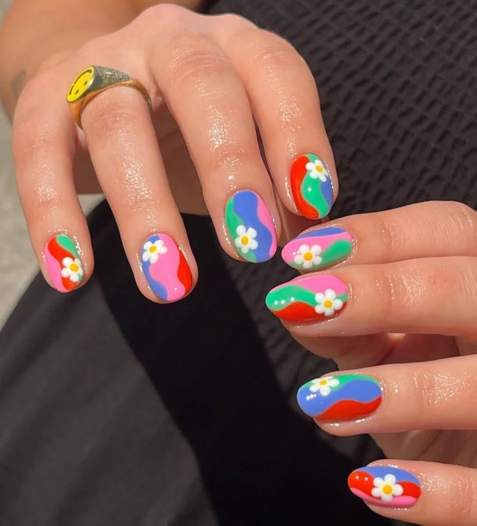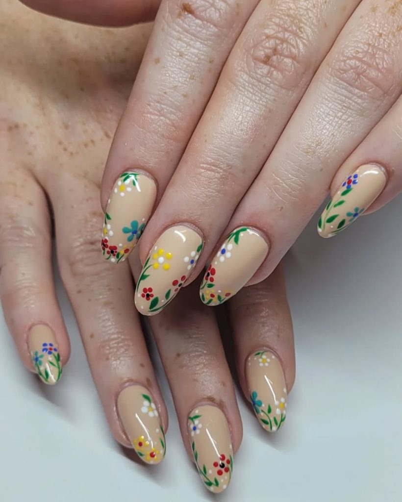 These nails are just FUN. A splash of bright colors, playful florals, and a bold combination of tone on tone make this design feel free-spirited and full of personality. It’s whimsical, artistic, and gloriously joyful—a wonderful fit for women who look at their nails as a means of elevating the mood. Of all the spring nail colors of 2026, this is a style that leans heavily into creativity (and confidence) over discretion.