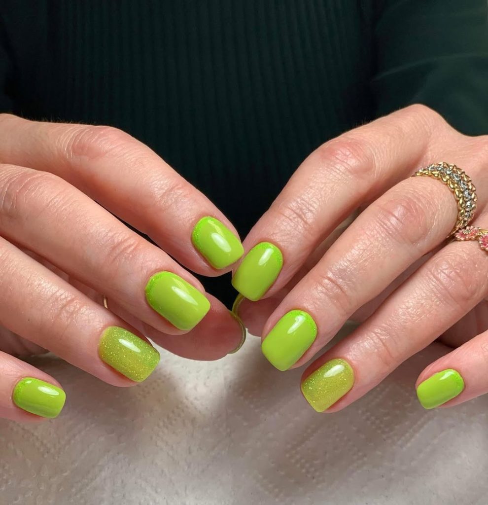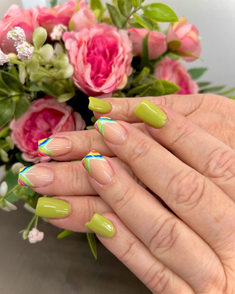 This design is the perfect simple choice, featuring a touch of personality that is easy to love. The green is perfect without being too loud or flat for a solid base of gel polish; the rainbow tips keep it from looking plain. This style is particularly flattering for short to medium lengths; while it works well now, it also aligns with 2026 trends that are already showcasing unexpected color combinations. This design is a fantastic source of inspiration if you’re looking for something bright that is easy on the eyes for everyday wear.