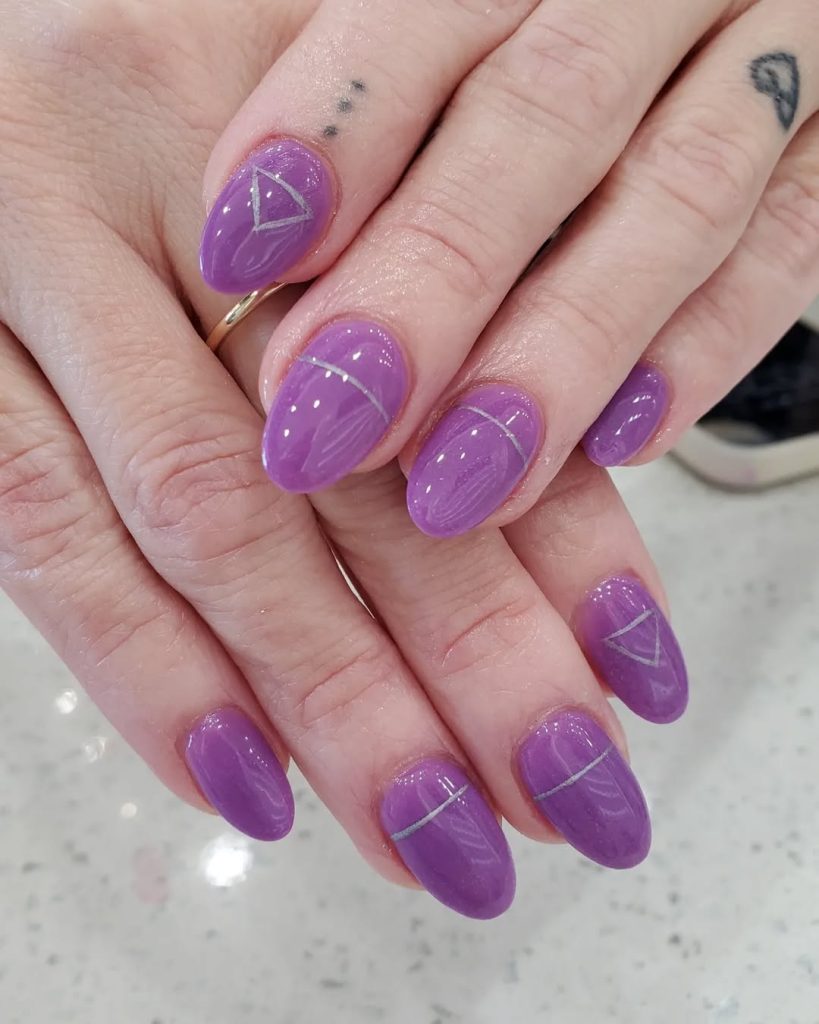 These nails are artistic without being excessive. The plain purple base is light and sheer enough to feel like the softest of bombers, but in a second glance you see silver rules that are structured enough to not look glaringly accidental. It’s a design that feels modern with considered details, ideal for women who prefer hints and whispers over big splashes. This colorway colorway is perfect for spring nail colors in 2026; it is a wonderful balance between creative and serene.