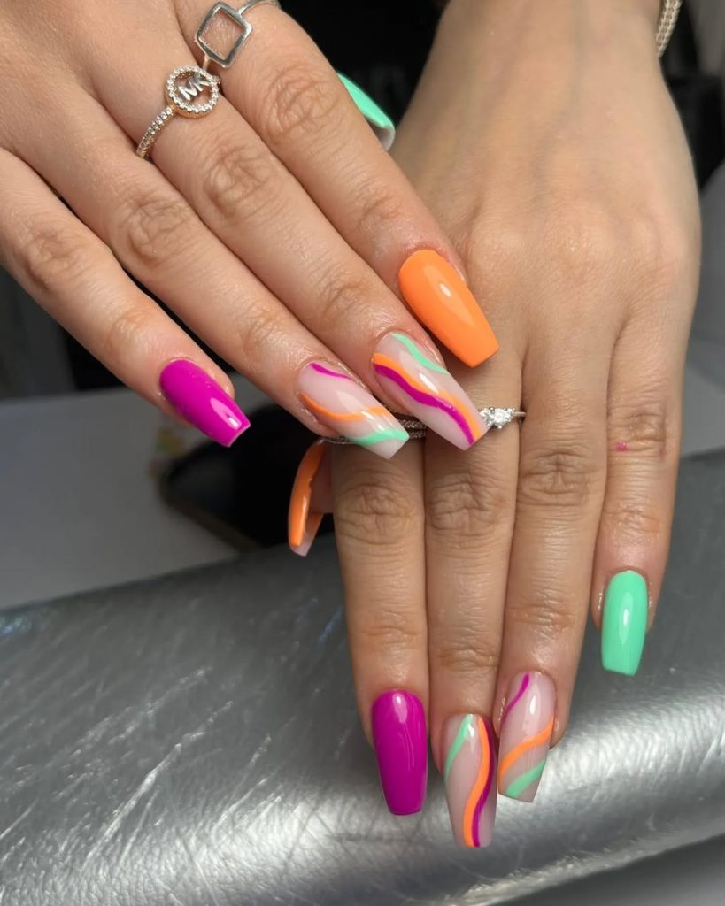 This design is perfect if you love playful combos but still want structure. The flowing lines maintain balance in the design, while the solid accent nails provide stability to the overall look. It works best with gel for clean edges and durability. Compared to more basic styles, this manicure feels more artistic, yet it still fits comfortably into 2026 trends focused on fun, wearable color.