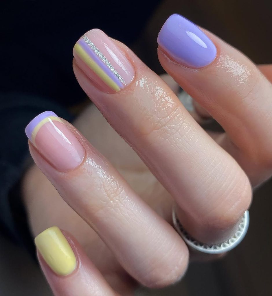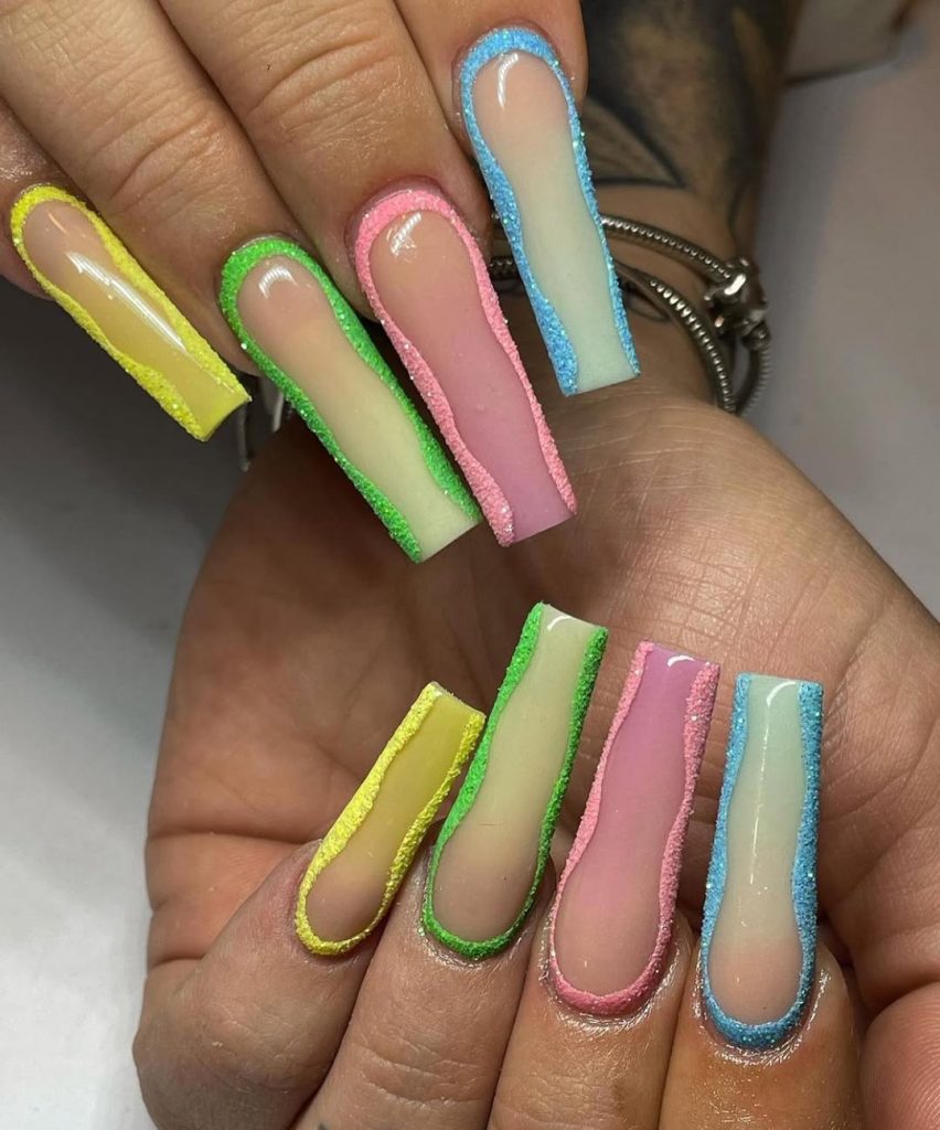These nails feel playful, creative, and a little daring—in the best way. The soft nude base keeps things grounded, while the pastel outlines add personality and movement. It’s a design that feels artistic but still clean, making it a standout example of spring nail colors for 2026 that don’t rely on heavy art. The mix of pink, blue, green, and yellow creates a joyful palette that feels lighthearted and modern at the same time.