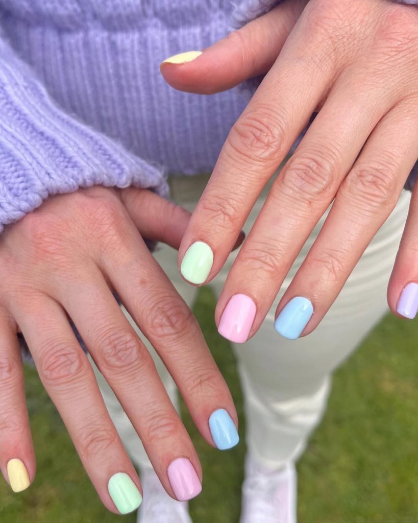 These nails are cheerful, calm, and pleasantly nonchalant. A range of pastel tones—pale blue, pink, green, and yellow—offer a happy palette that feels like it was thrown together, but everything’s in balanced harmony. It’s bright, but not brash, and it exudes a sort of carefree spring energy that feels very now. This look represents the playful side of spring nail colors for 2026 and is accessible to nearly everyone.