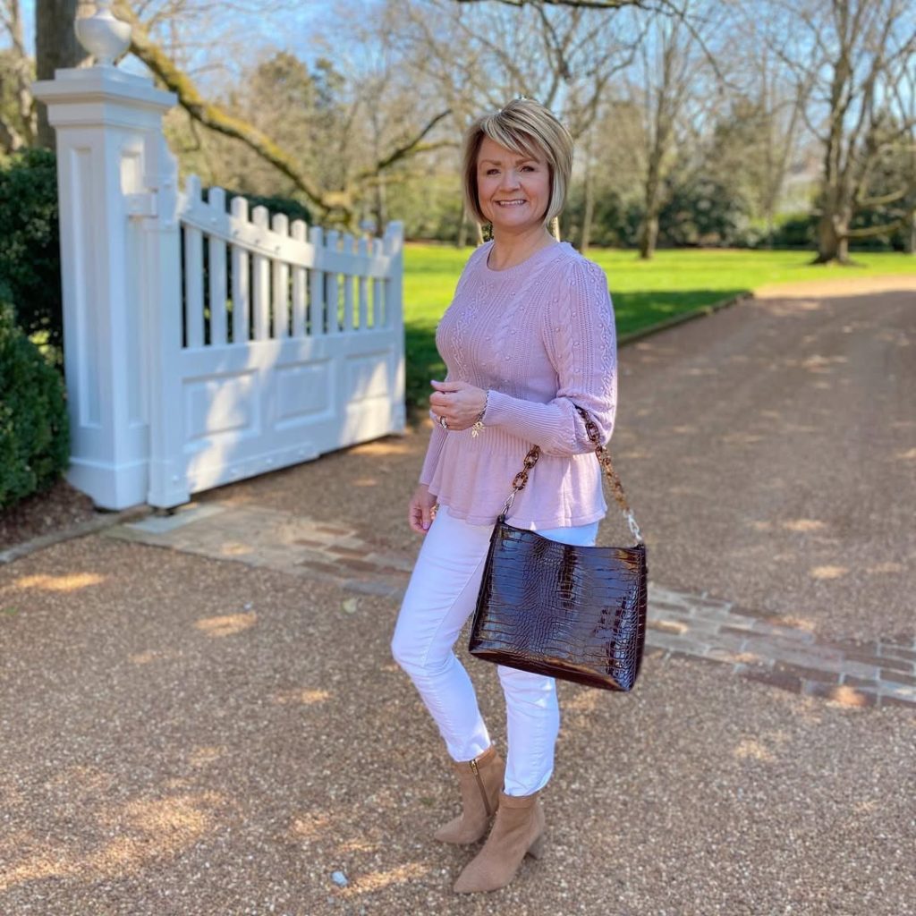 A gentle pink knit paired with crisp white denim creates a fresh spring balance that feels timeless and approachable, perfect for everyday elegance.