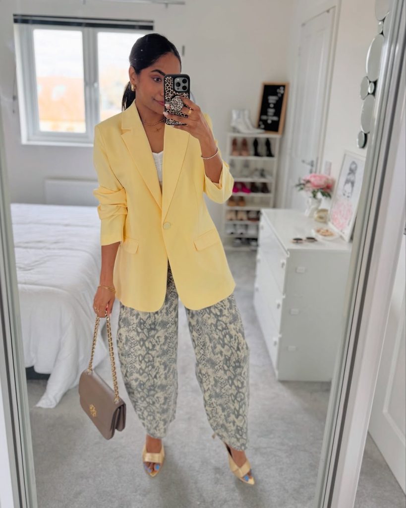 A sunny blazer paired with softly printed trousers delivers spring optimism wrapped in confident polish.