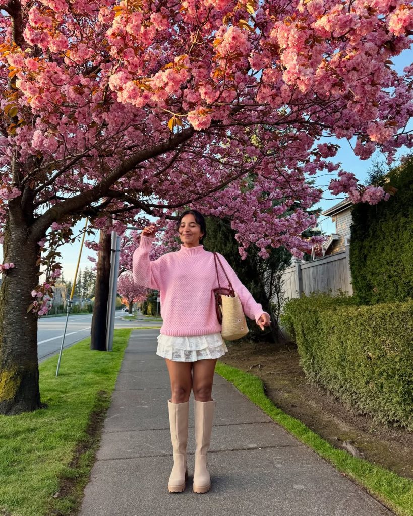 A textured rose sweater and ruffled mini skirt capture playful spring energy beneath flowering trees.