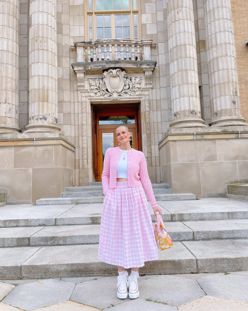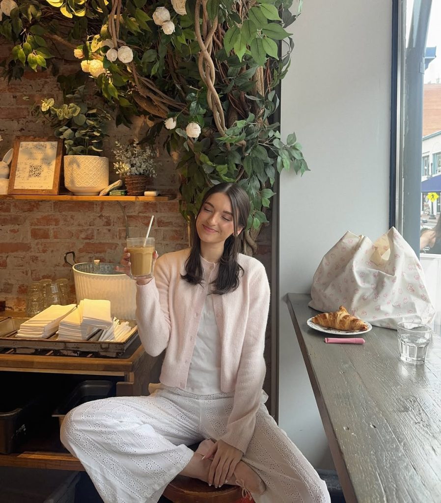 A blush cardigan layered over airy whites creates a dreamy spring uniform made for lingering lattes and quiet corners.