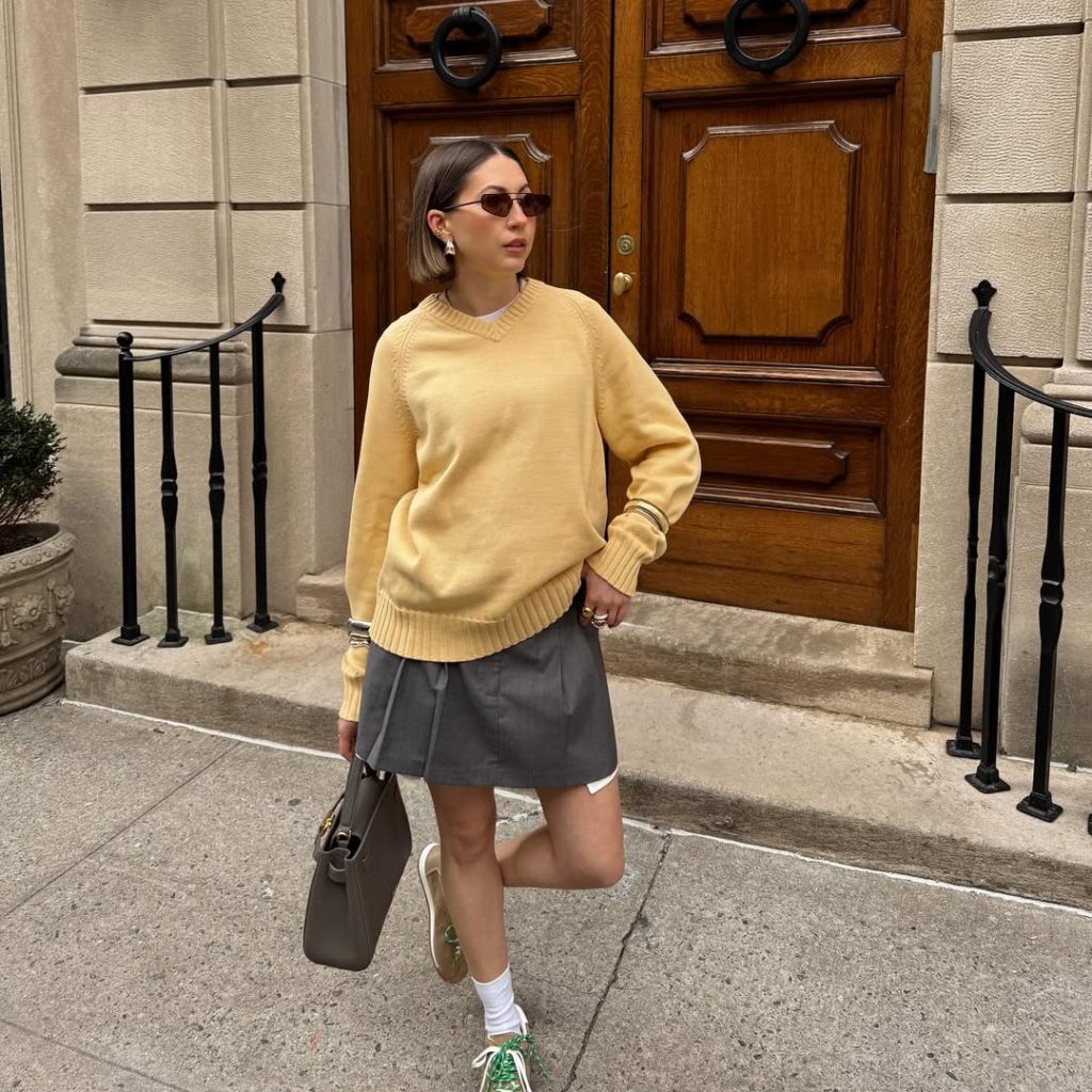 A buttery yellow sweater paired with a tailored mini skirt delivers collegiate polish with city confidence.