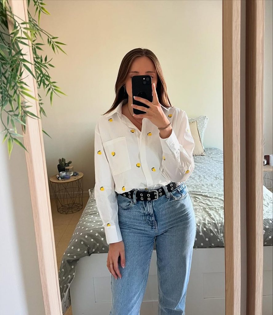 A crisp white blouse scattered with citrus embroidery paired with vintage-wash denim feels cheerful yet sharply put together.