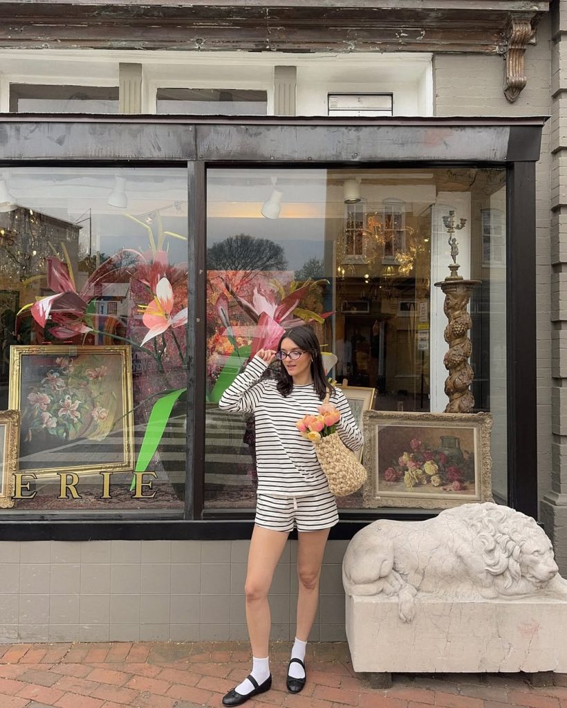 A matching striped set styled with vintage-inspired shoes delivers breezy spring charm and effortless coordination.