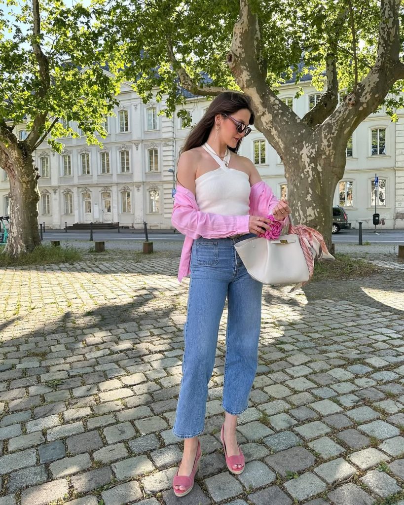 A halter knit paired with straight denim and a pink wrap shirt delivers effortless femininity with metropolitan confidence.