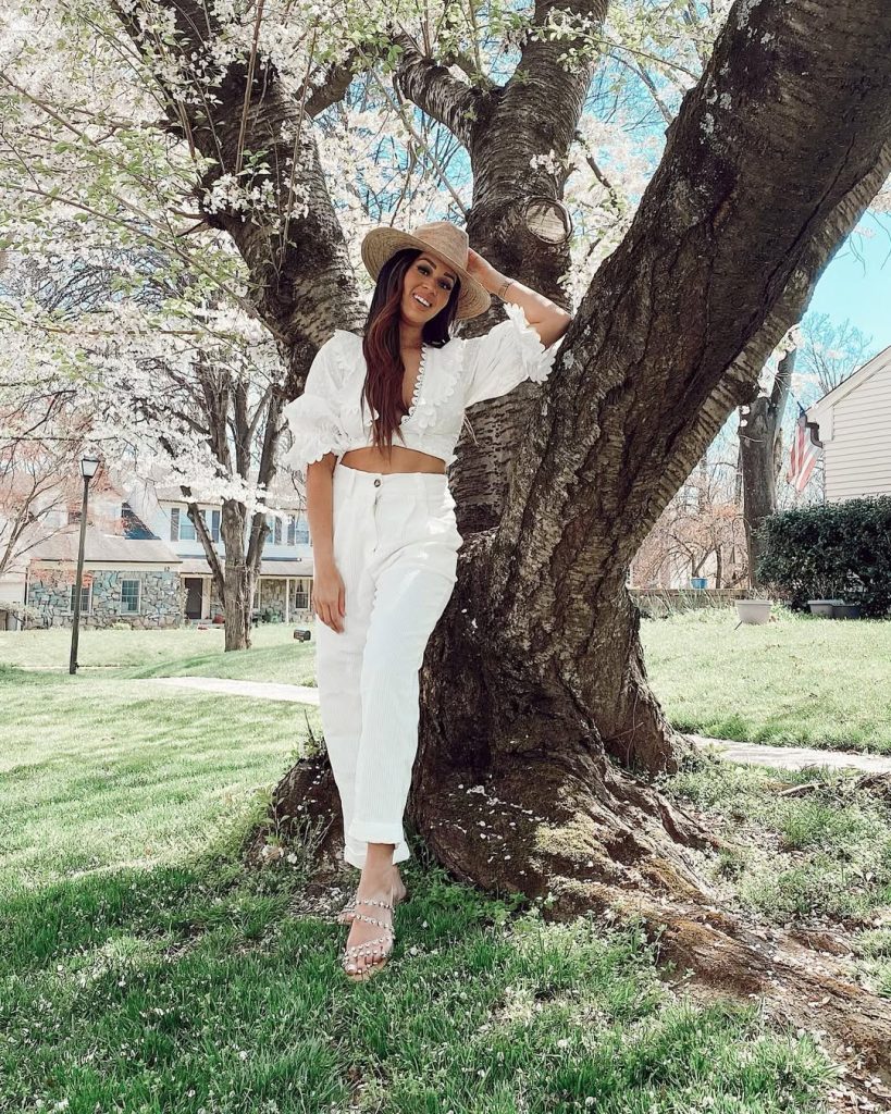 An all-white ensemble with delicate textures captures spring’s optimism, blending softness with confident femininity.