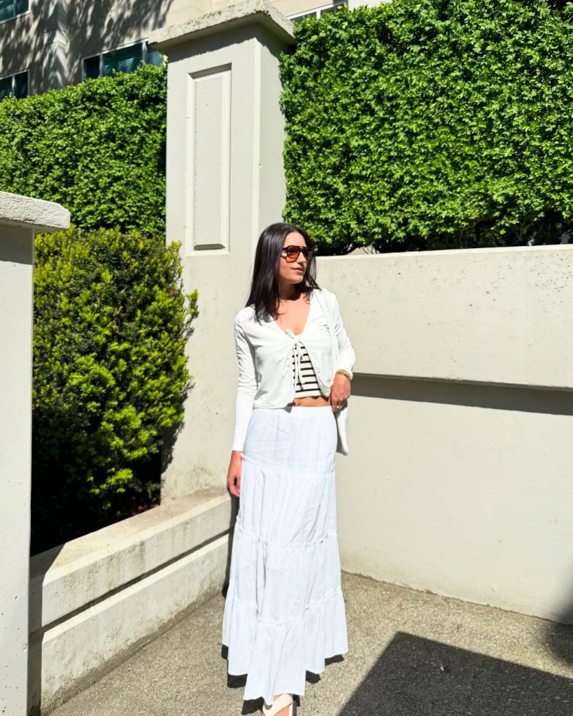 Soft knit layers and crisp white trousers create a look that feels gentle, fresh, and quietly confident.