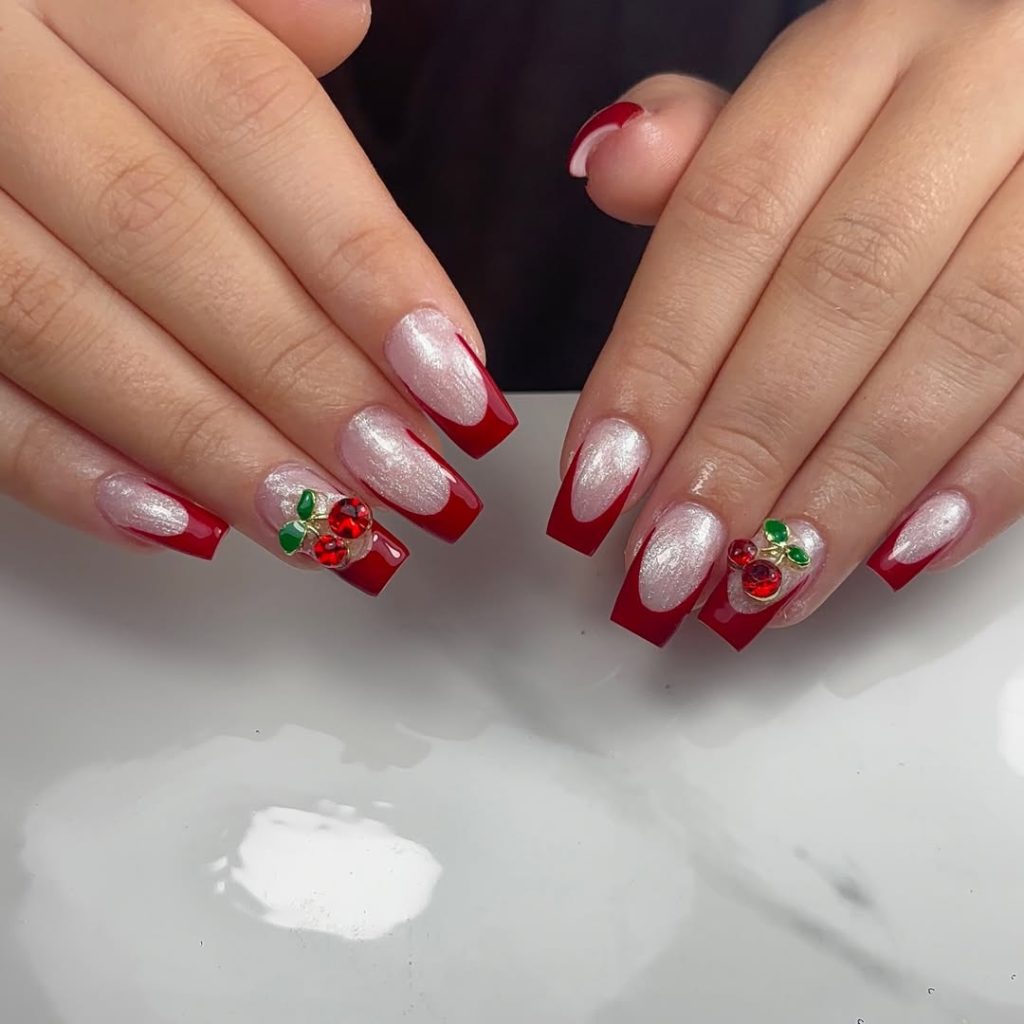 There’s something undeniably confident about a bold red tip on a crisp square nail. This look feels like a little wink to classic glamour, but with a fresh 2026 twist. The pearly base softens the drama, while those glossy cherry accents add just enough sparkle to make it playful. It’s a blend of cuteness and fun, exuding an air of “I have plans”—even if your only plans involve brunch with friends.