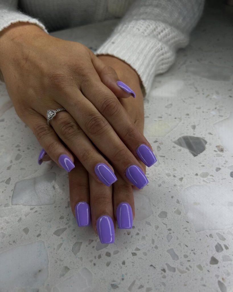 Lavender has that magical ability to feel calm and confident at the same time. This glossy purple shade on perfectly sculpted square nails looks clean, balanced, and modern. It’s the kind of color that quietly elevates your whole look without needing extra embellishment.