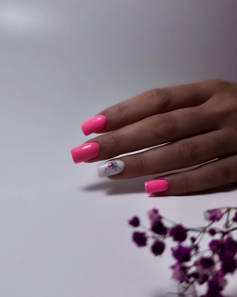 There’s something about a vibrant Pink manicure that instantly shifts your mood. This bold square set feels confident, playful, and unapologetically feminine. The glossy finish gives it that glassy, polished look, while the single floral accent nail softens the intensity just enough. It’s Cute, but not shy. It’s Fun, but still grown-up. Honestly, it is the type of hue that causes you to lift your coffee cup slightly higher.