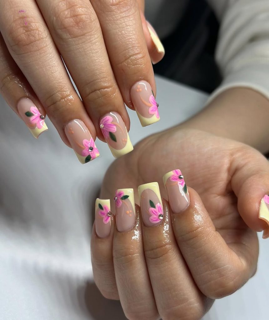 This delicate blend of Yellow French tips and pink floral artwork feels like a garden party in manicure form. The square shape keeps it structured, but the soft details add warmth and personality. It’s one of those Designs that feels thoughtful and romantic without being overly busy. There’s a light, almost nostalgic charm here that’s hard to ignore.