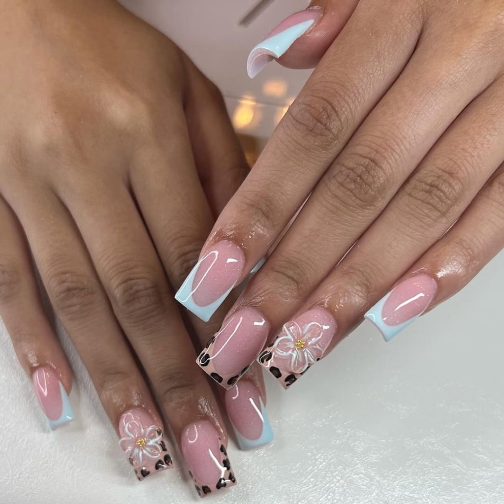This combination of soft Pink bases and baby Blue French tips feels playful and creative. Add in the delicate floral accent and subtle animal-print detail, and suddenly you have a manicure full of personality. It’s sweet, a little daring, and undeniably Fun. The square shape keeps everything balanced and modern.