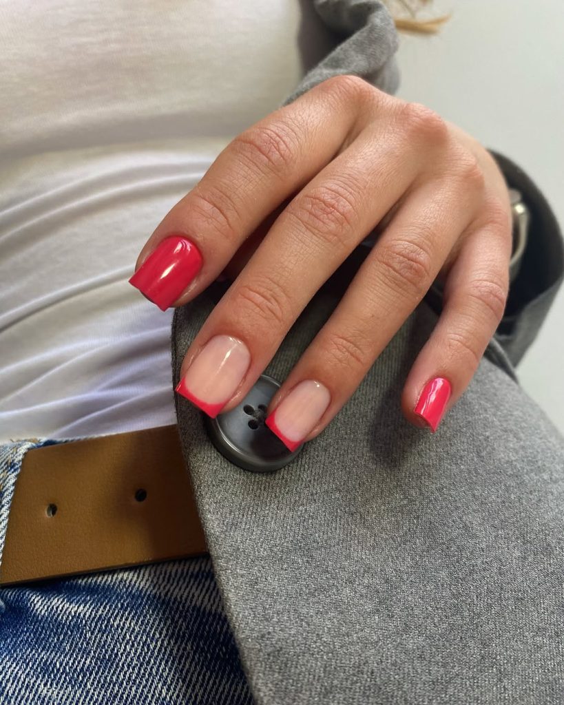 This coral Pink French tip instantly feels energetic, like the first truly warm day of Spring. The clean square edges keep it polished, while the vivid tips add just enough personality. This design, despite its simplicity, manages to create a striking impression. There’s something very modern about pairing a nude base with a bold edge—it feels fresh, confident, and completely wearable for 2026.