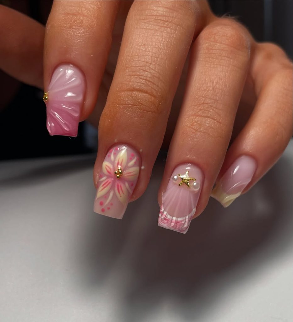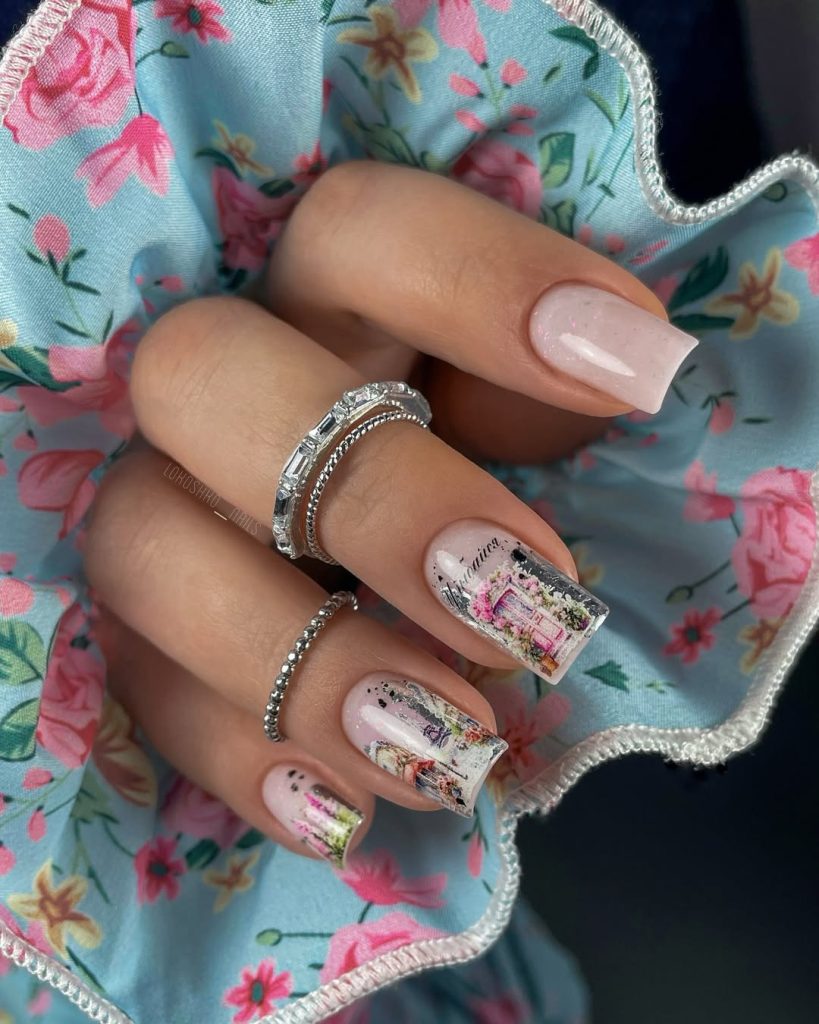 There’s something almost artistic about these square nails. The delicate collage-style artwork layered over a sheer base feels curated, like tiny pieces of art you carry with you. It’s not just a manicure—it’s a conversation starter. The soft tones give it a gentle, romantic Summer vibe.