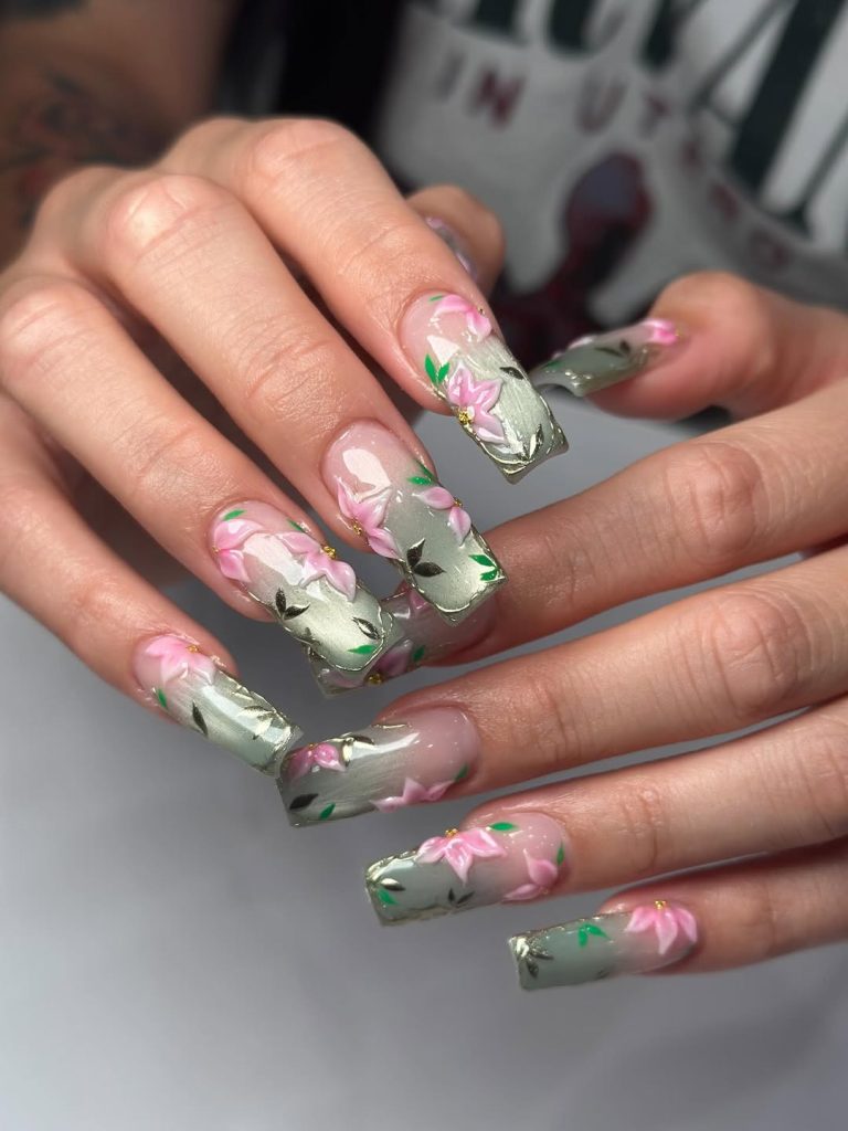 This combination of Pink and muted Green feels like spring in manicure form. The square shape keeps it structured, while the playful accent nail adds a little artistic flair. It’s Cute without being girly and fresh without trying too hard. There’s something about soft color blocking that instantly lifts your mood.