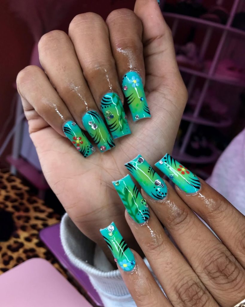 Now, this is pure Fun. The vibrant Green base blended with tropical-inspired patterns and sparkling crystals feels bold and unapologetic. It’s lively, expressive, and full of personality. These Long square nails aren’t trying to blend in—they’re here to be seen. And honestly? That’s part of the charm.